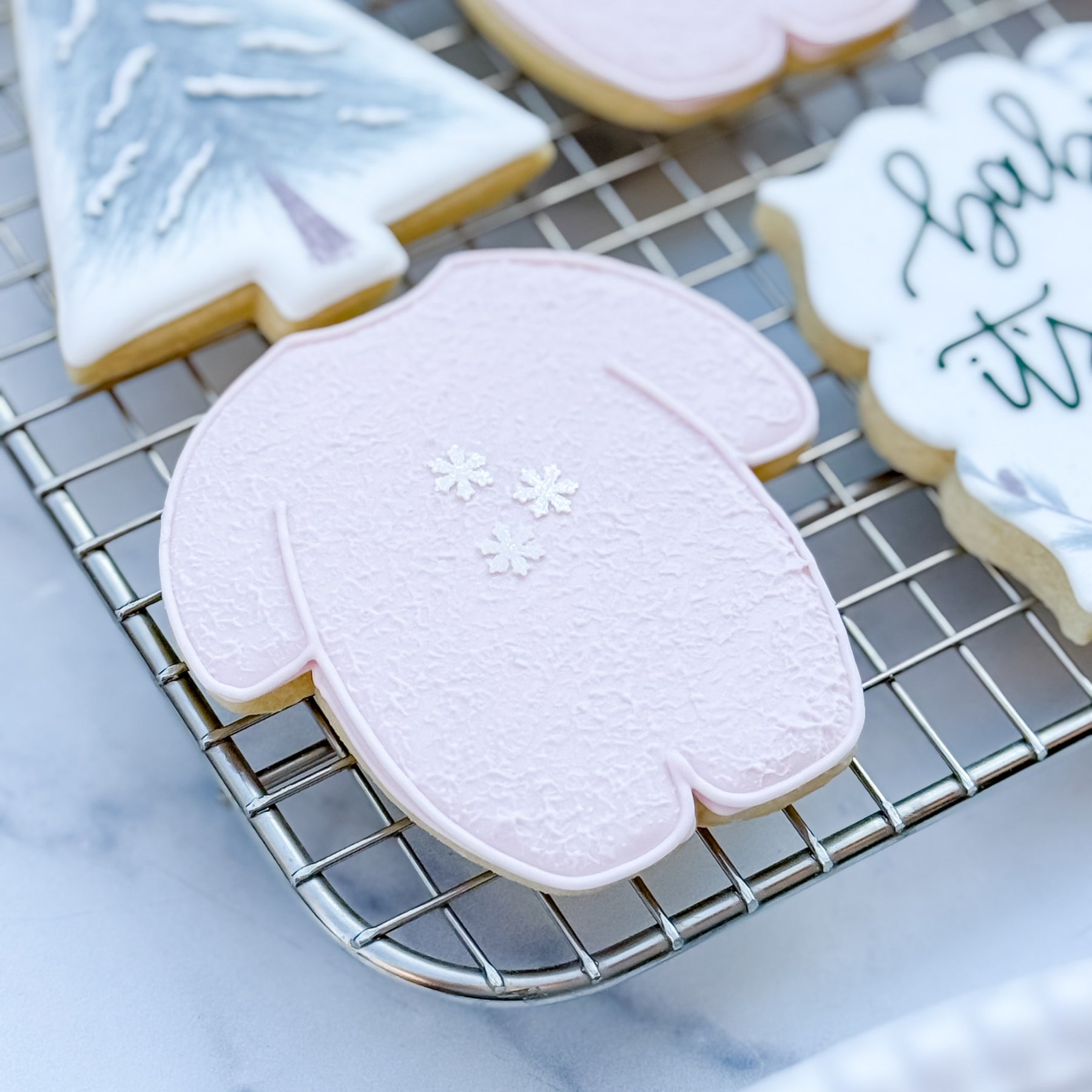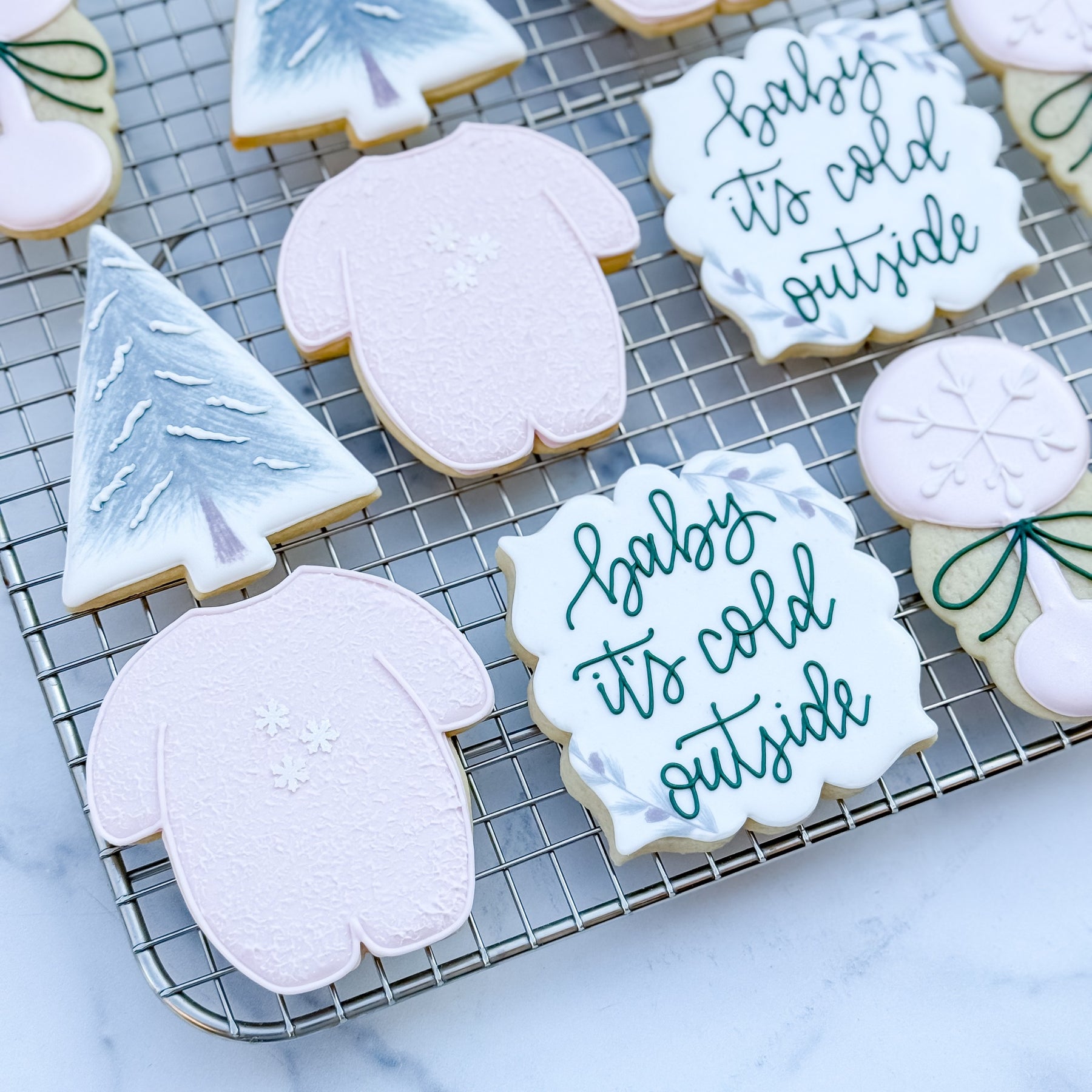These custom decorated cookies are perfect for celebrating a new winter baby. The set features winter onesies, rattles, pine trees, and plaques. Spread the winter magic with this sweet set!