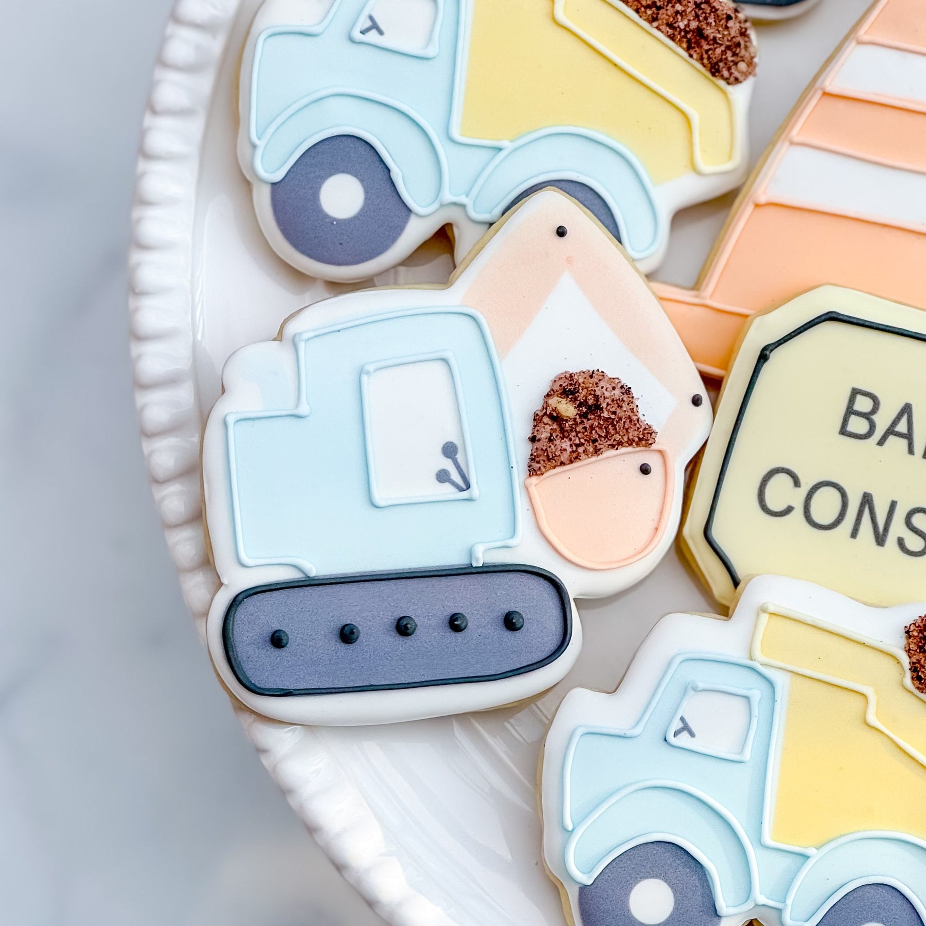 Whether you're planning a construction themed baby shower or announcing a pregnancy, these cookies are just what the contractor called for! The set includes dump trucks, digging trucks, traffic cones, and plaques. Individual wrapping is included!