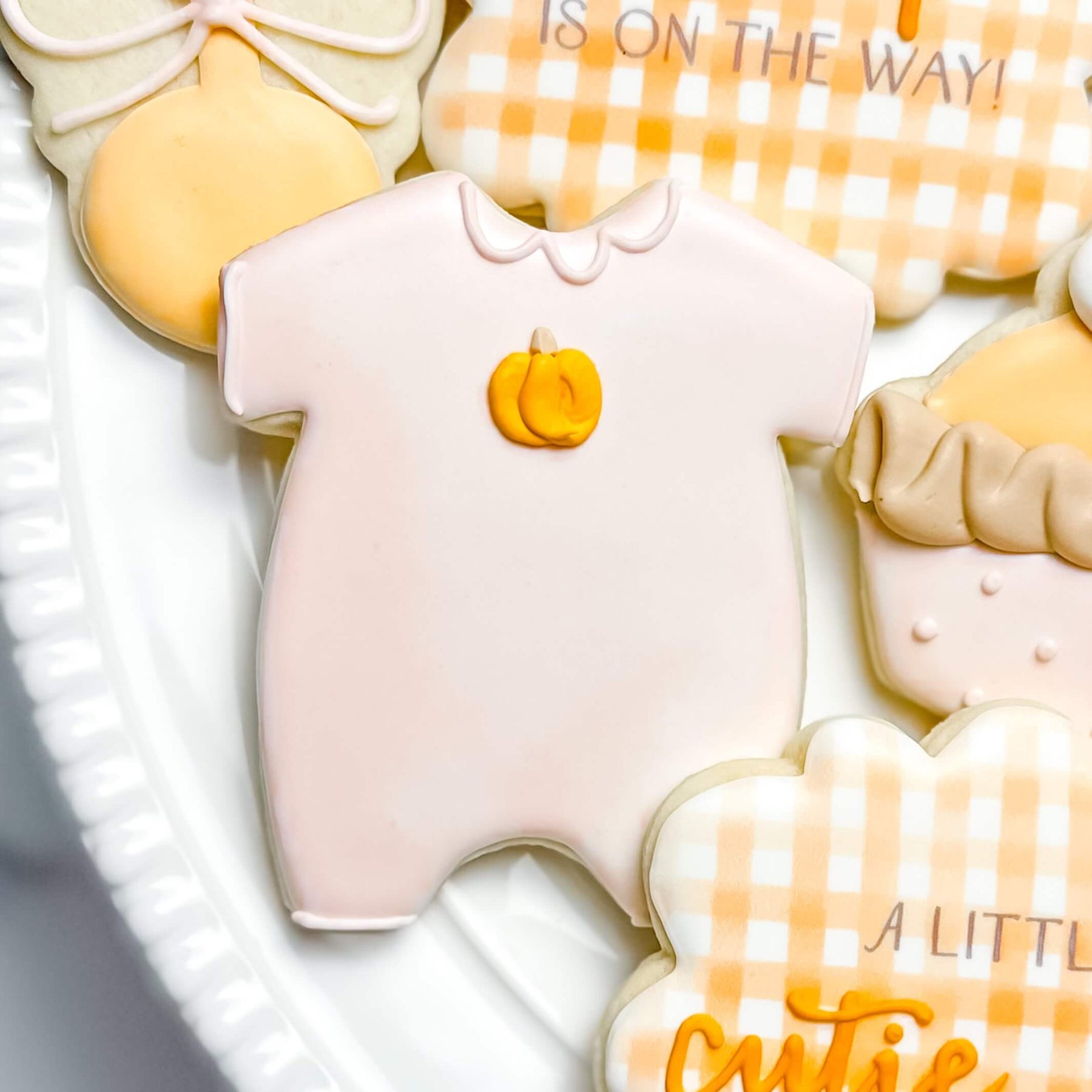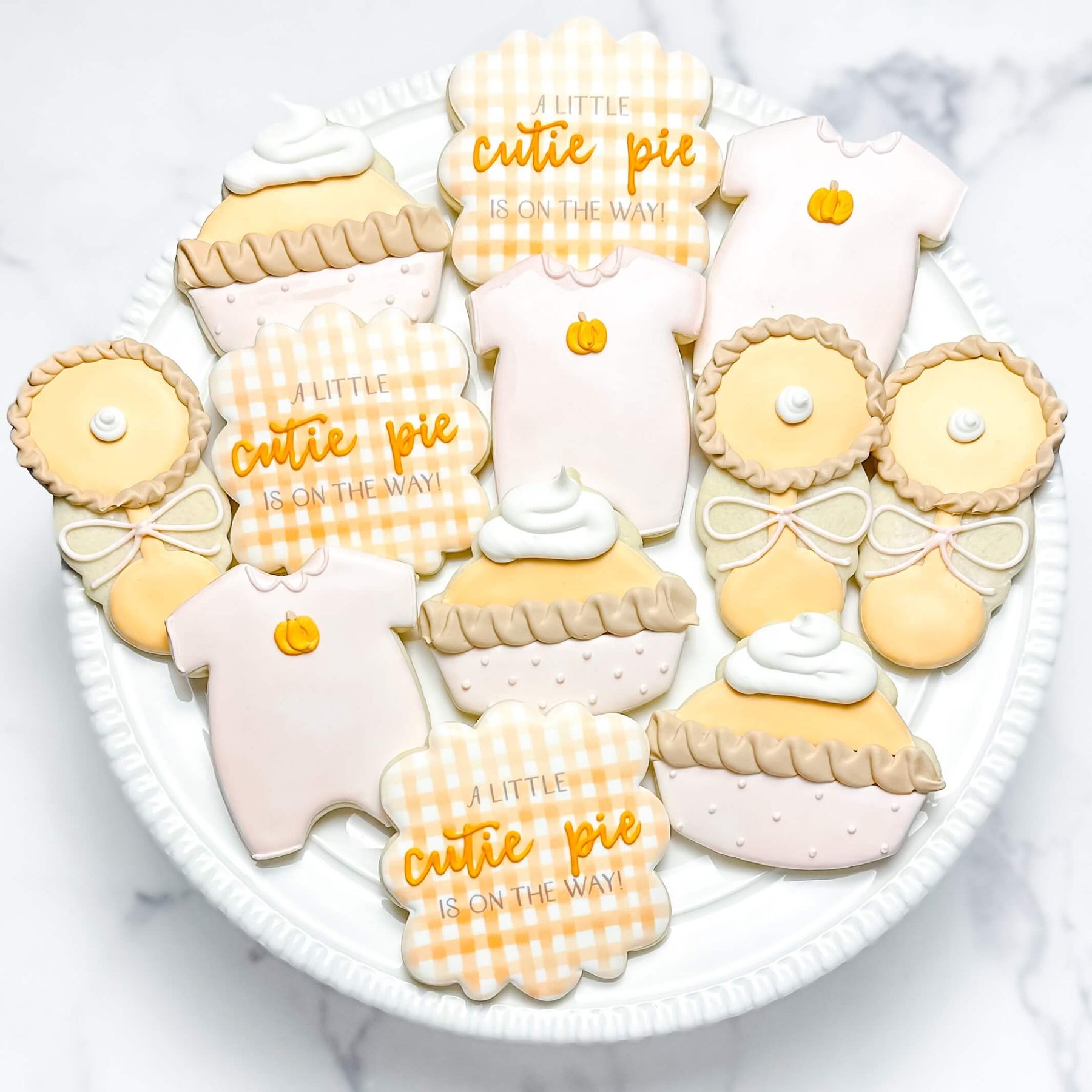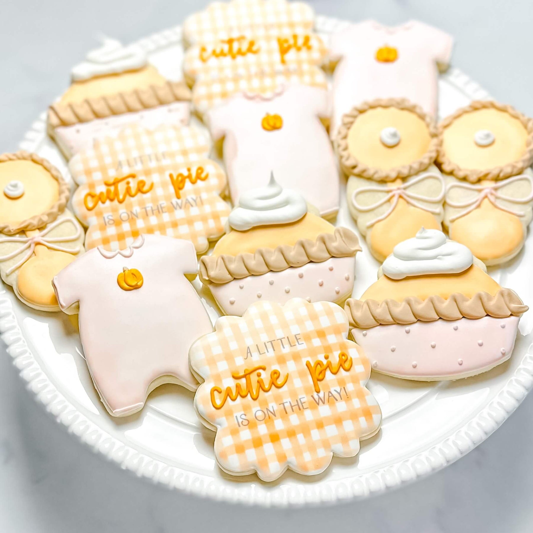 Celebrate a sweet little pumpkin with these fall favorites! This cookies set includes "cutie pie" plaques, pumpkin rompers, pumpkin pie rattles, and pumpkin pies topped with whipped cream. Individual wrapping is included.