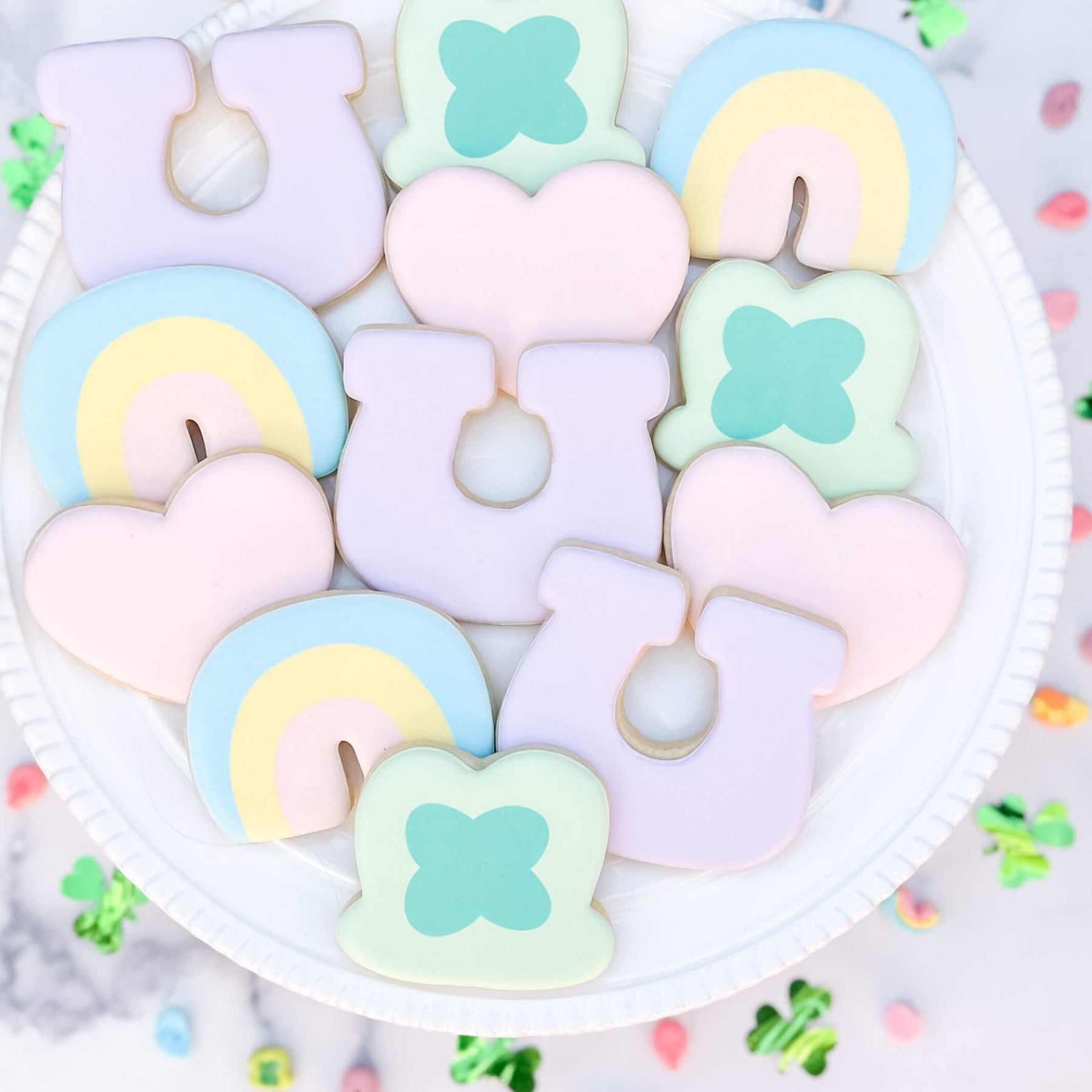 This decorated cookie set is the perfect way to celebrate this lucky holiday! The sugar cookies will come decorated as pictured and will feature an equal mix of four-leaf clovers, hearts, horseshoes, and rainbows.