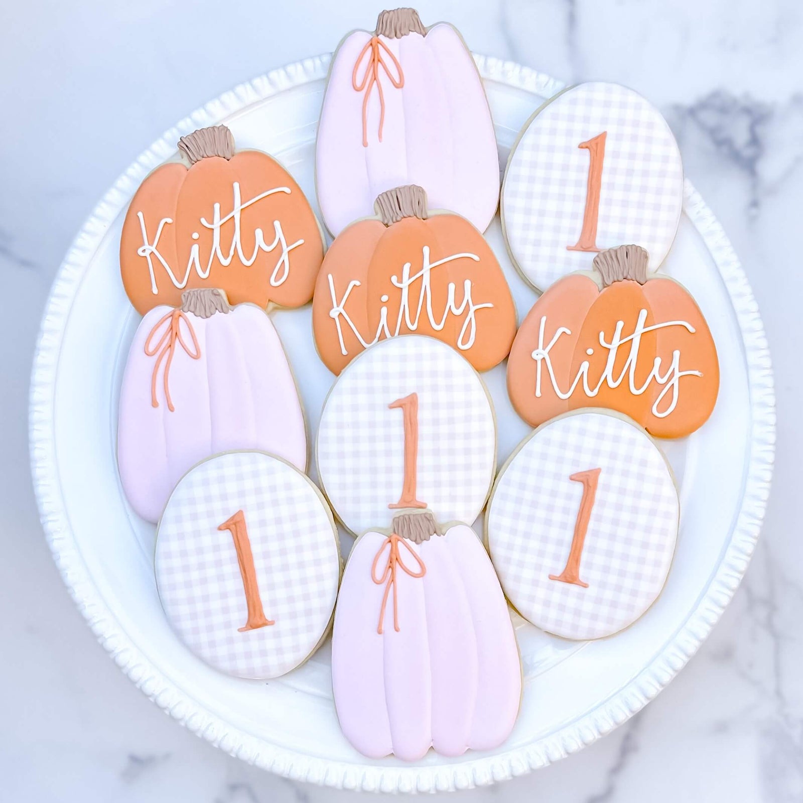 Celebrate those Autumnal birthdays with this perfectly pink pumpkin set! The cookies come as pictured, with personalized name pumpkins, pink pumpkins with bows, and gingham age plaques. Individual wrapping is included.