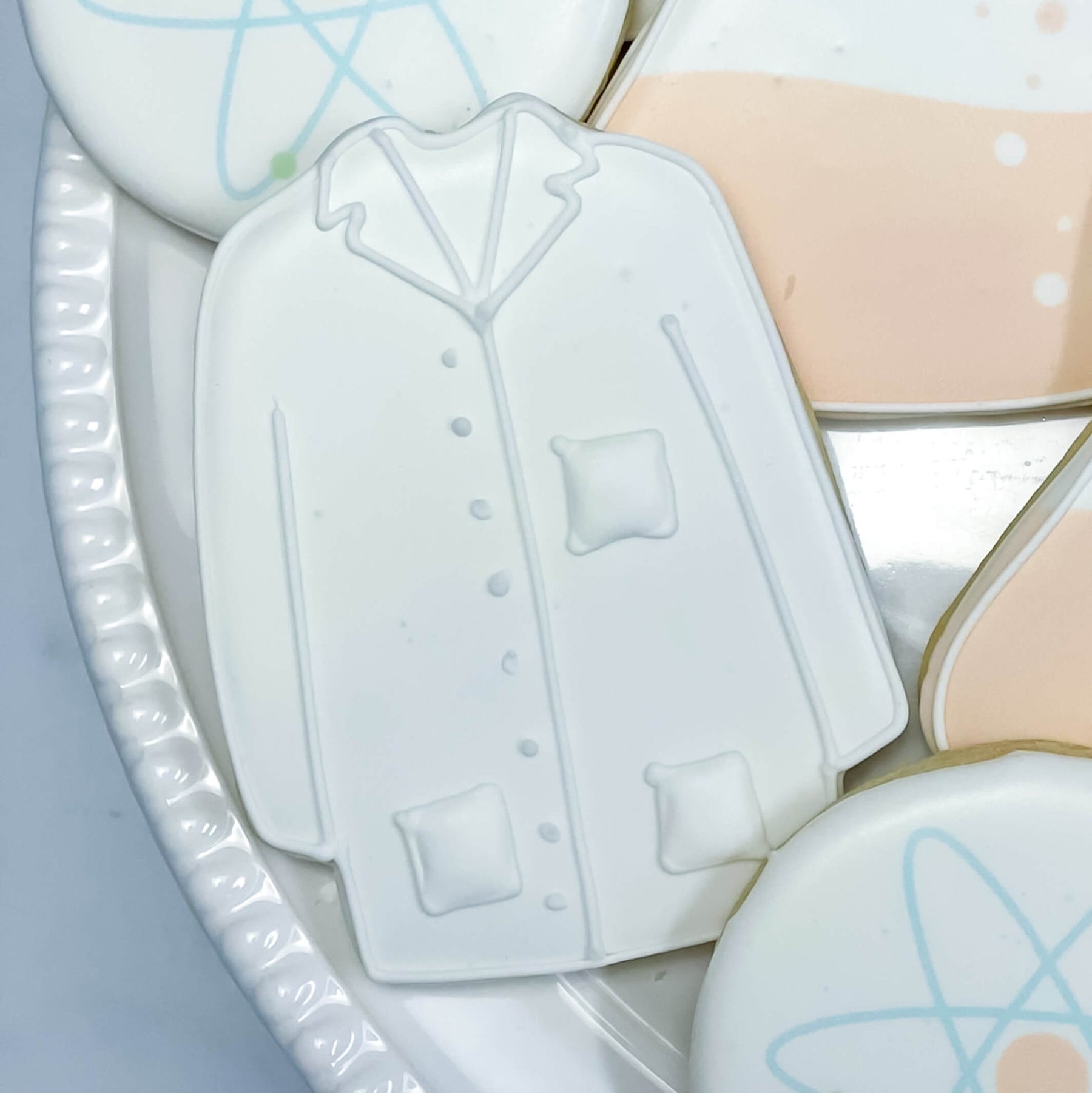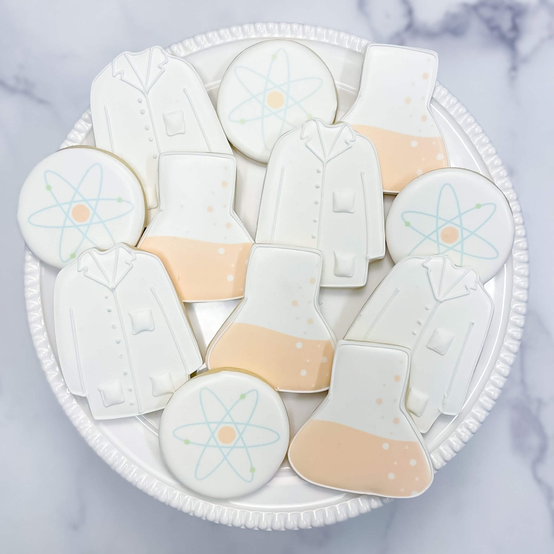Make new discoveries with our science themed decorated sugar cookies! The set comes as pictured, with lab coats, atomic structures, and flasks. Individual wrapping is included in the cost.