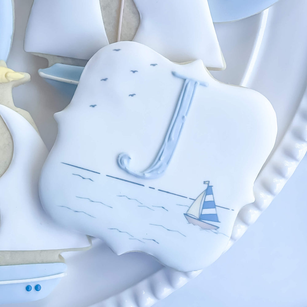 Sail away with this coastal birthday set--perfect for any sailor! The cookie set comes as pictured, with sailboats, seascape plaques, and lighthouse plaques. Personalize the name below! The initial piped on the seascape plaque will be the first letter of the name provided.