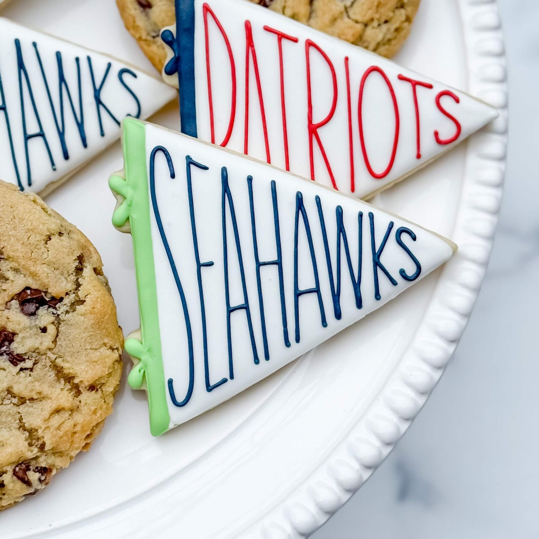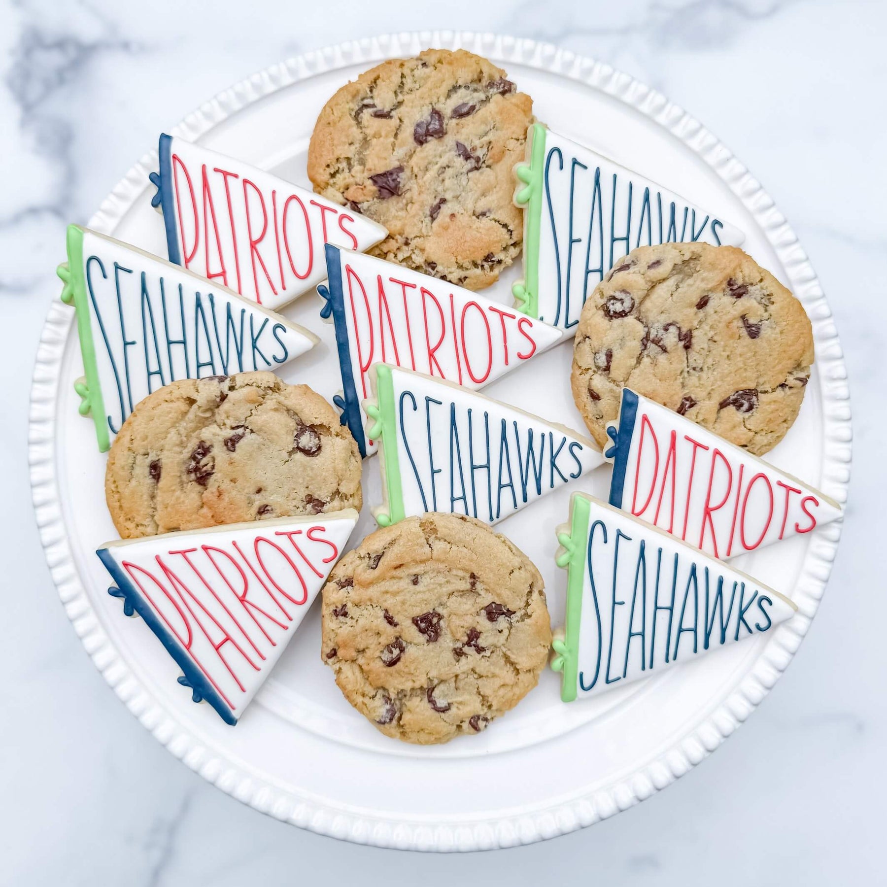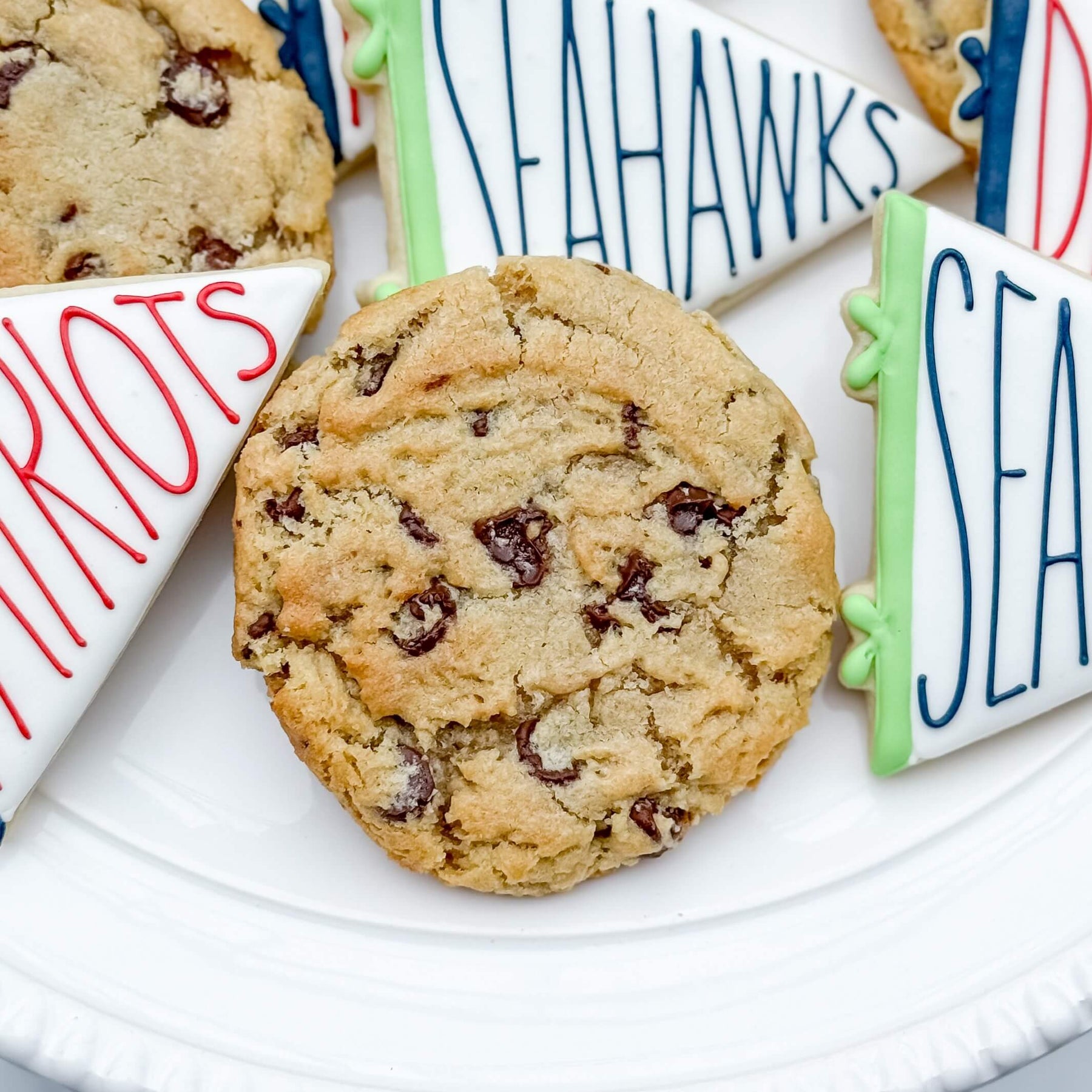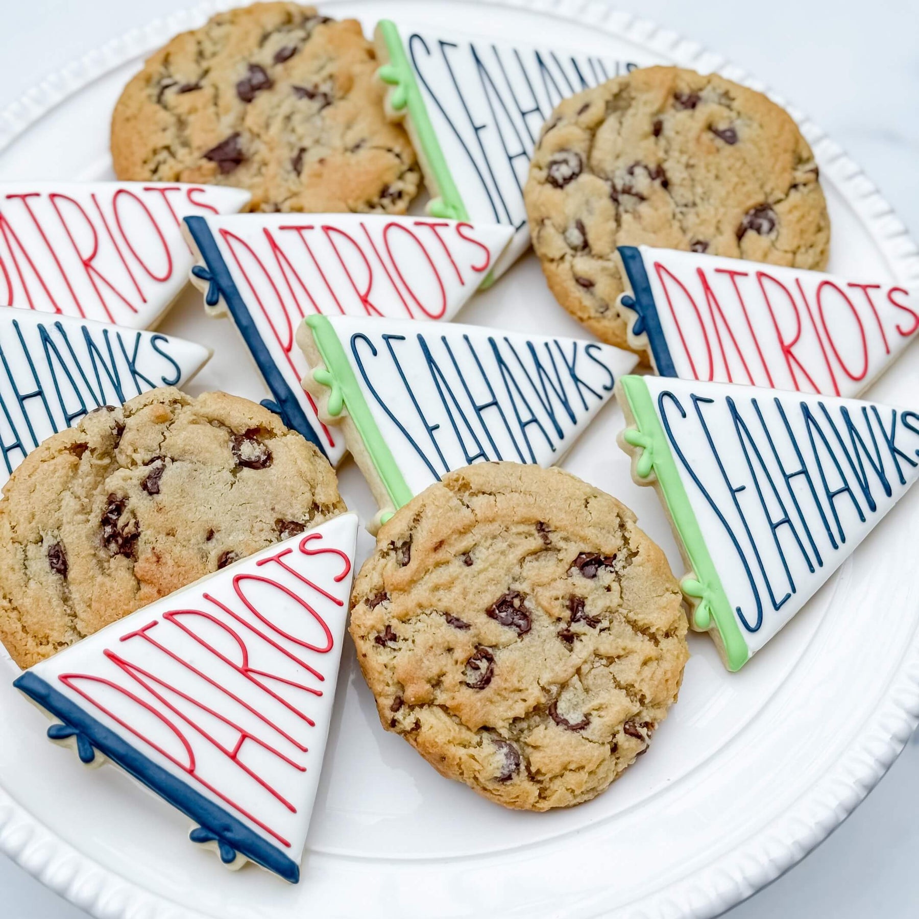 Bring the heat this Game Day with a variety that's sure to please all football fanatics! This set comes with an even mix of Sea Salt Chocolate Chip Cookies, Seahawks pennant flag sugar cookies, and Patriots pennant flag sugar cookies. Individual wrapping is included in the cost!