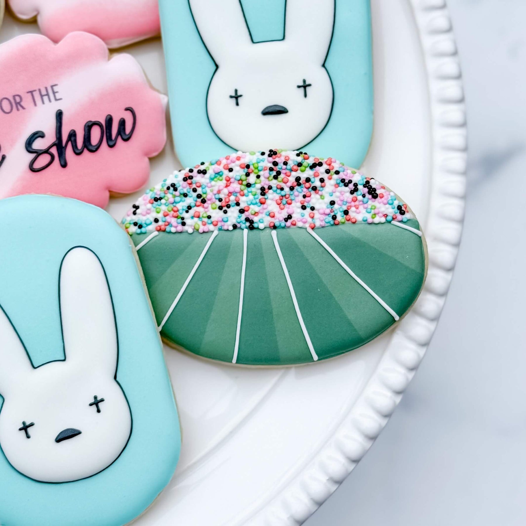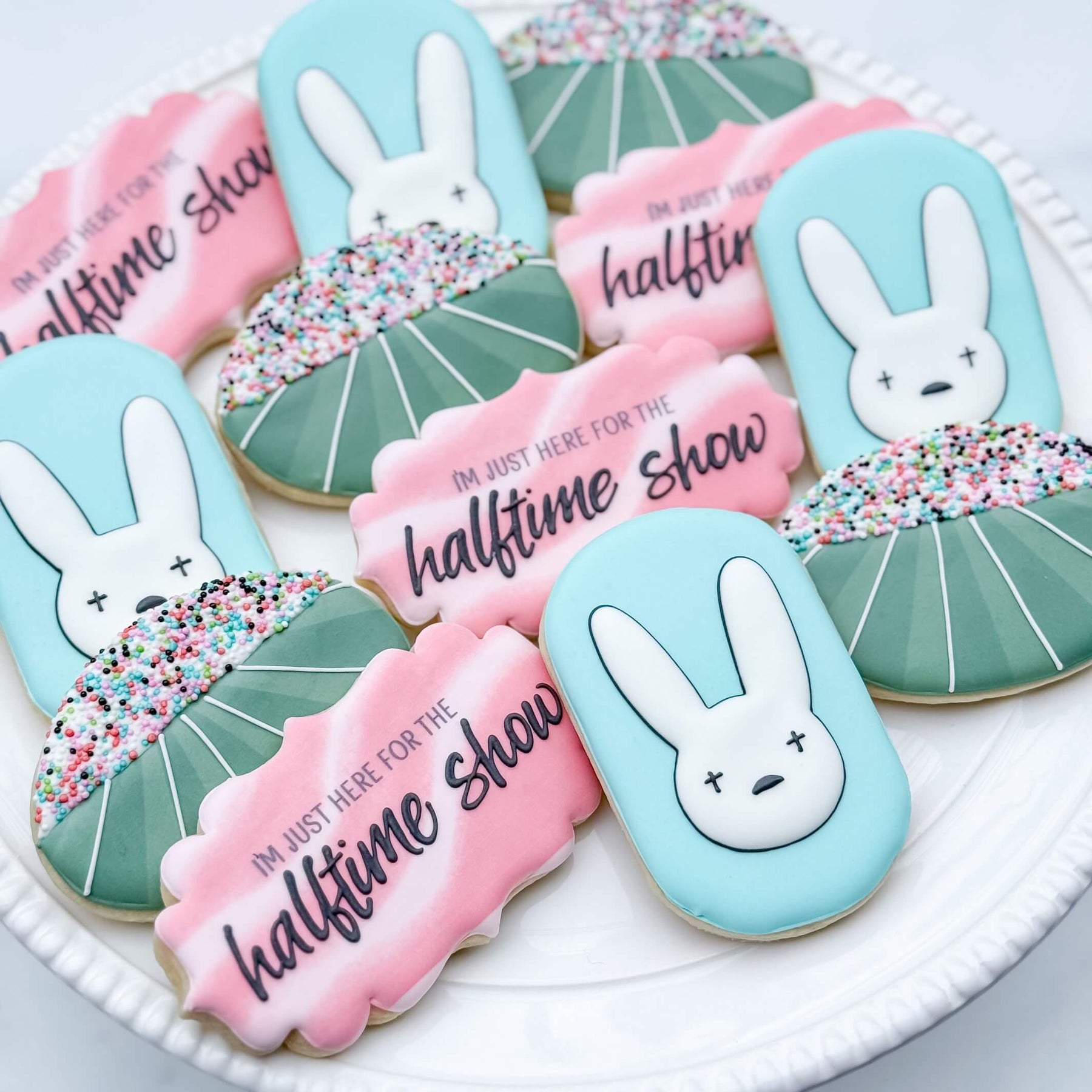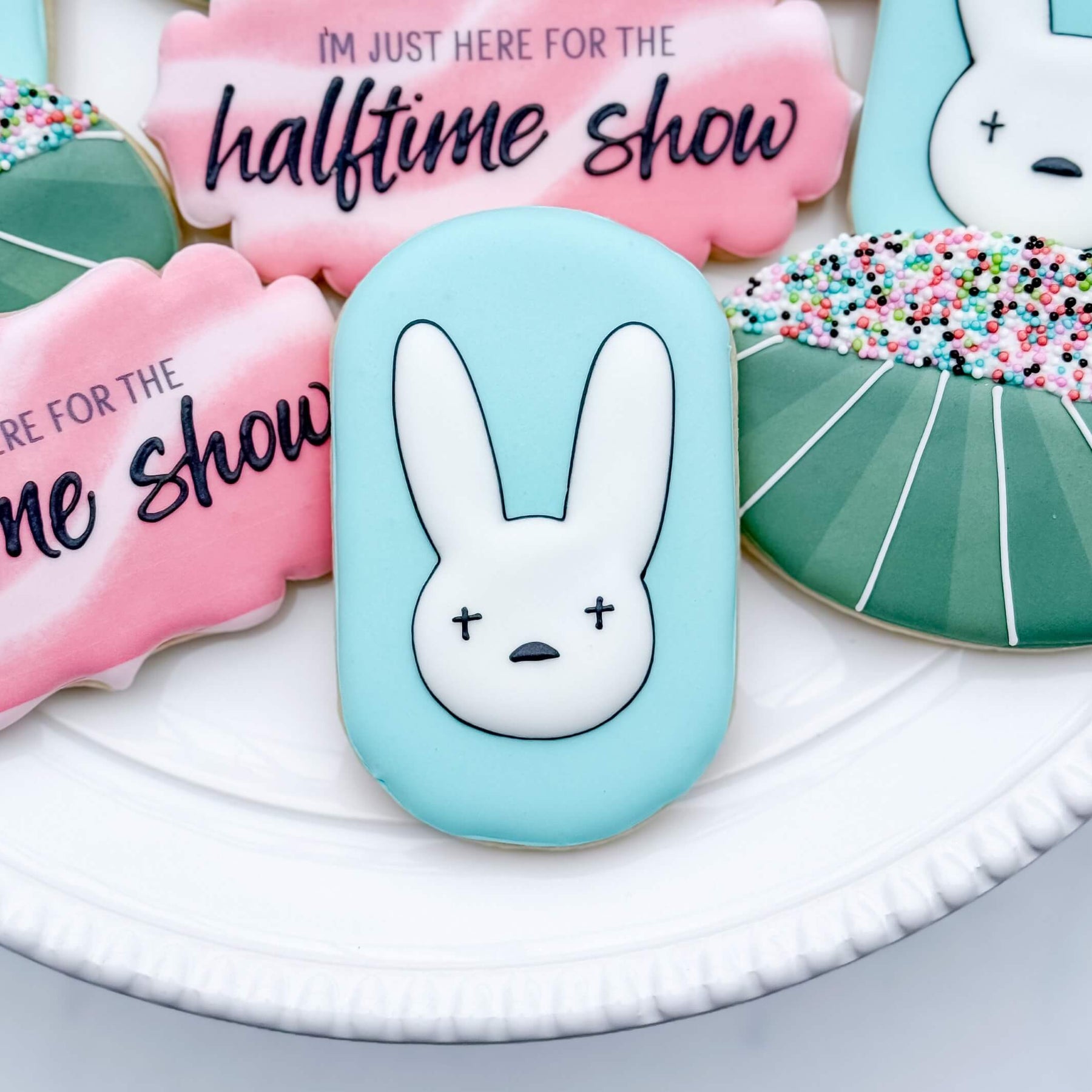 If you're just here for the halftime show (and maybe the snacks and commercials), we've got you covered! This set features colorful halftime plaques, bunny plaques, and stadiums. Each cookie comes individually wrapped!