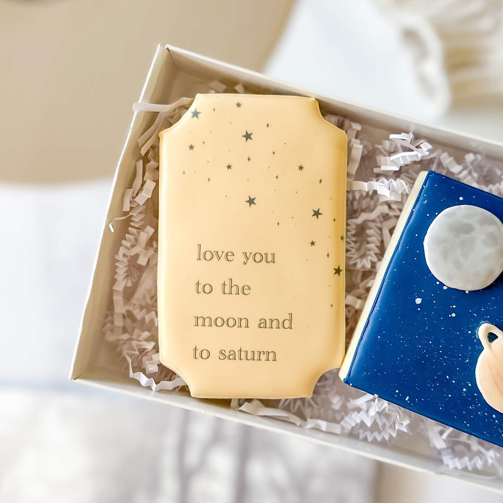 This decorated cookie duo is the perfect way to show that your love is out of this world! The cookies will come decorated as pictured. The white gift box,  white crinkle paper and individual wrapping is included in the price.