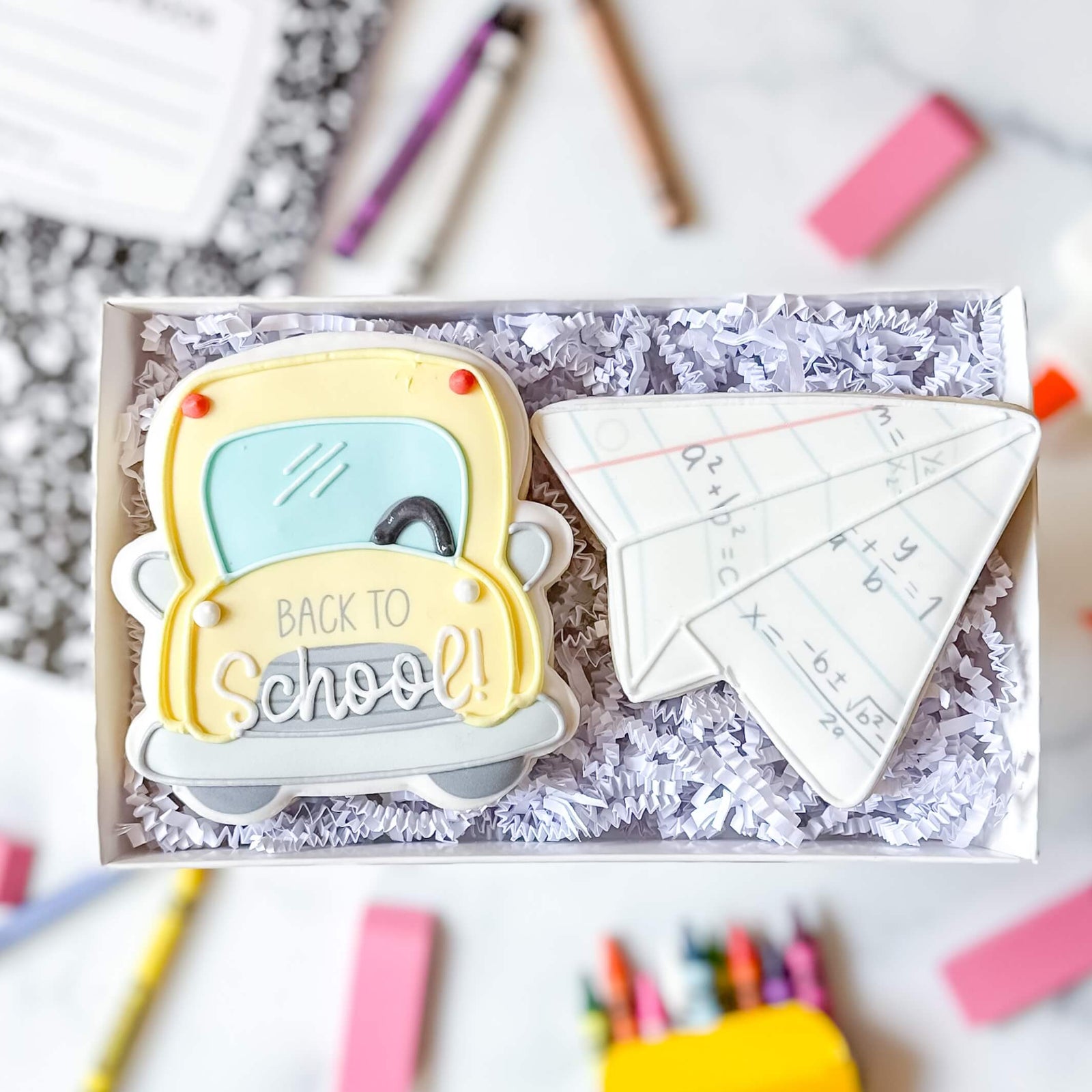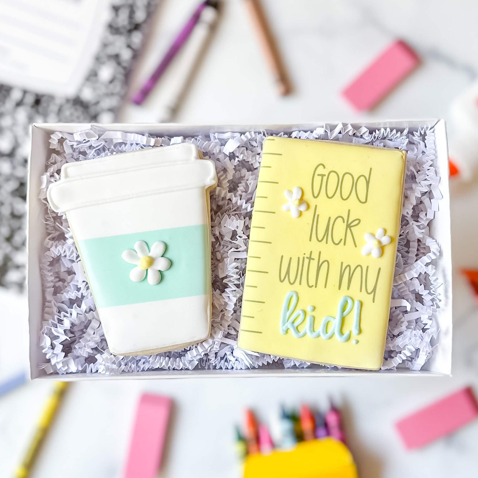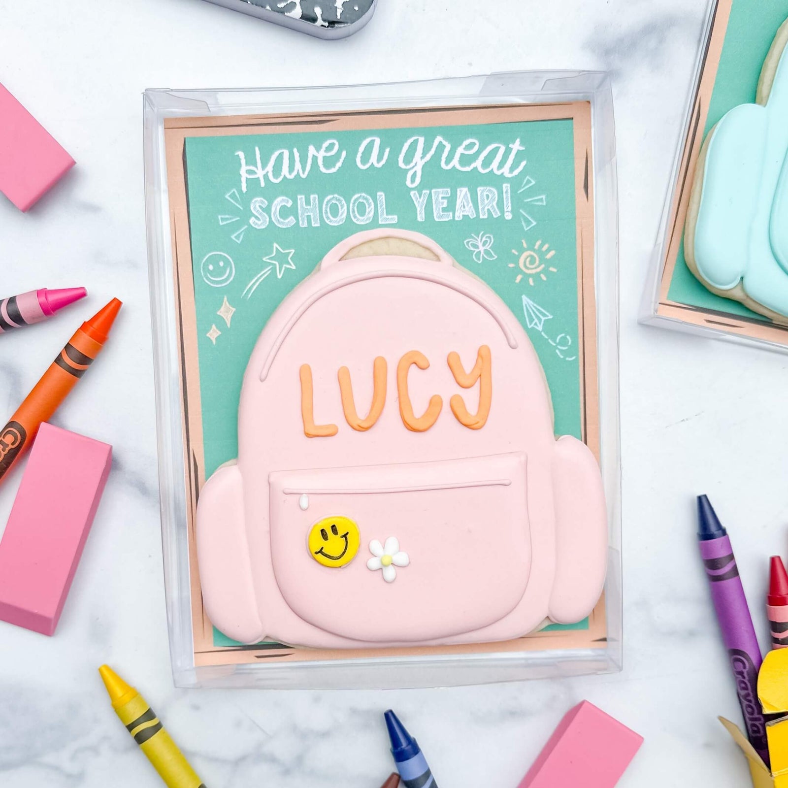 This personalized backpack cookie gift box is the perfect back to school treat! The cookie is larger than our standard size cookies! It comes individually bagged in the cookie gift box with a school themed backing.