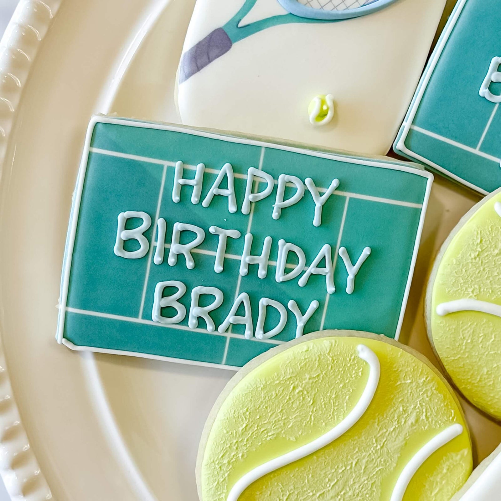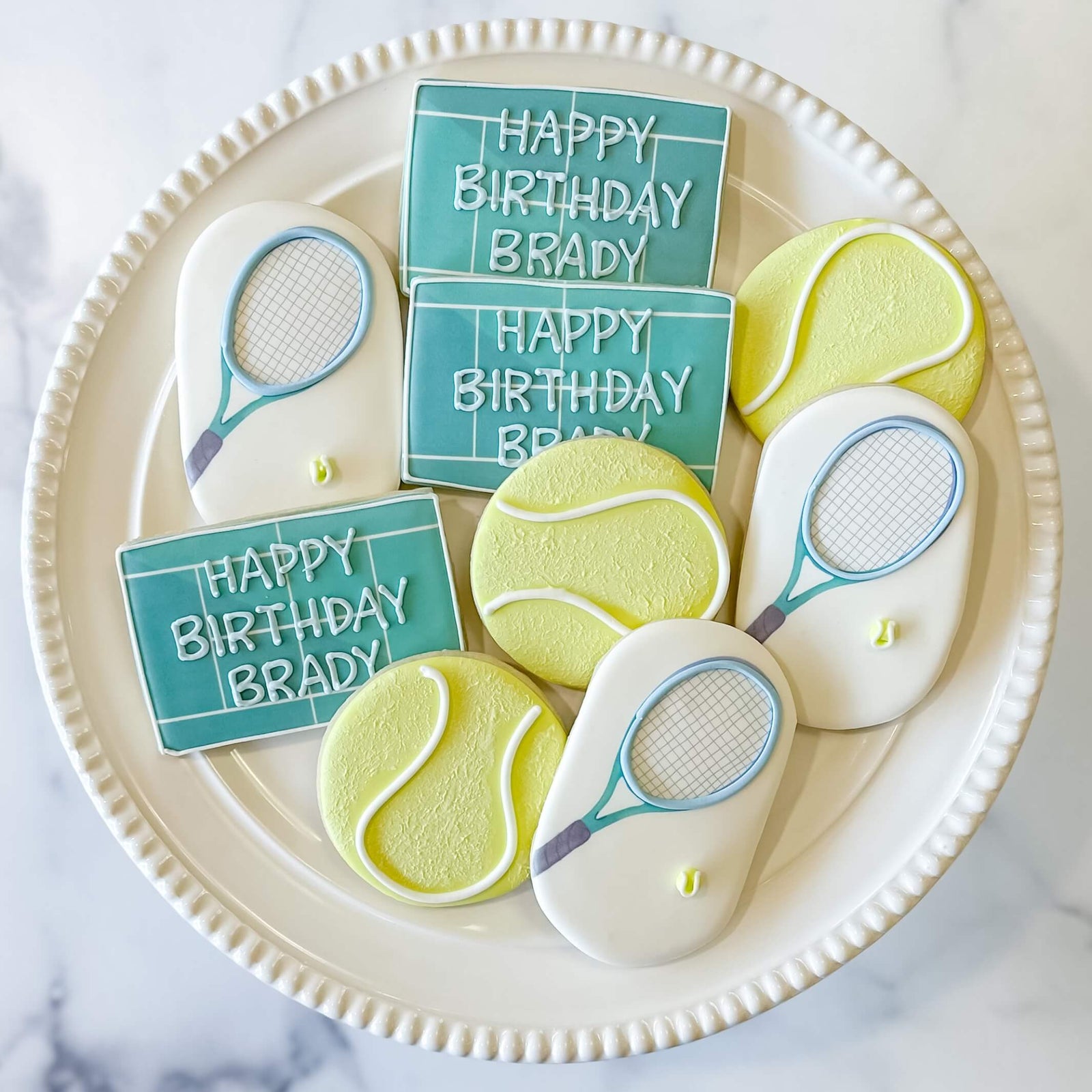 This decorated cookie set is the perfect way to wish your favorite tennis star a Happy Birthday! The sugar cookies will come decorated as pictured and will feature an equal mix of tennis ball cookies, racket cookies and HAPPY BIRTHDAY _________ court cookies. Individual wrapping is included in the price of the set.Â