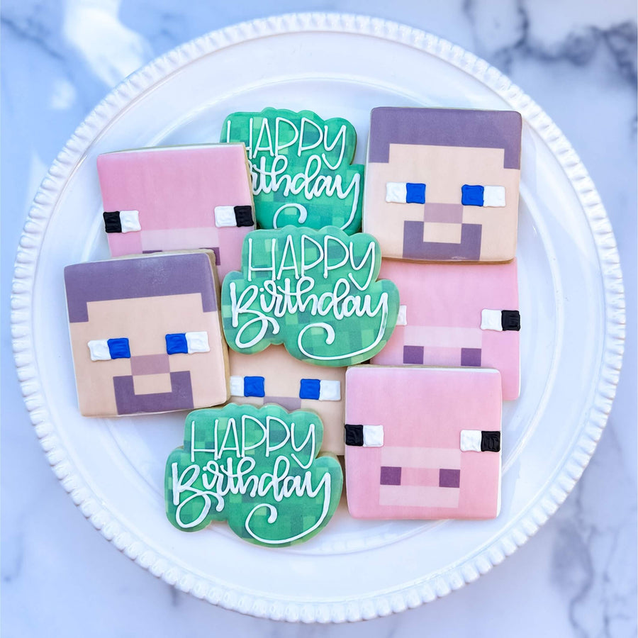 This decorated cookie set is the perfect gift for your little gamer, or sweet treat to add to your Minecraft themed birthday party! The sugar cookies will come decorated as pictured and will feature an equal mix of Happy Birthday plaque cookies, pig cookies and Steve cookies. Individual wrapping is included in the price of this set.