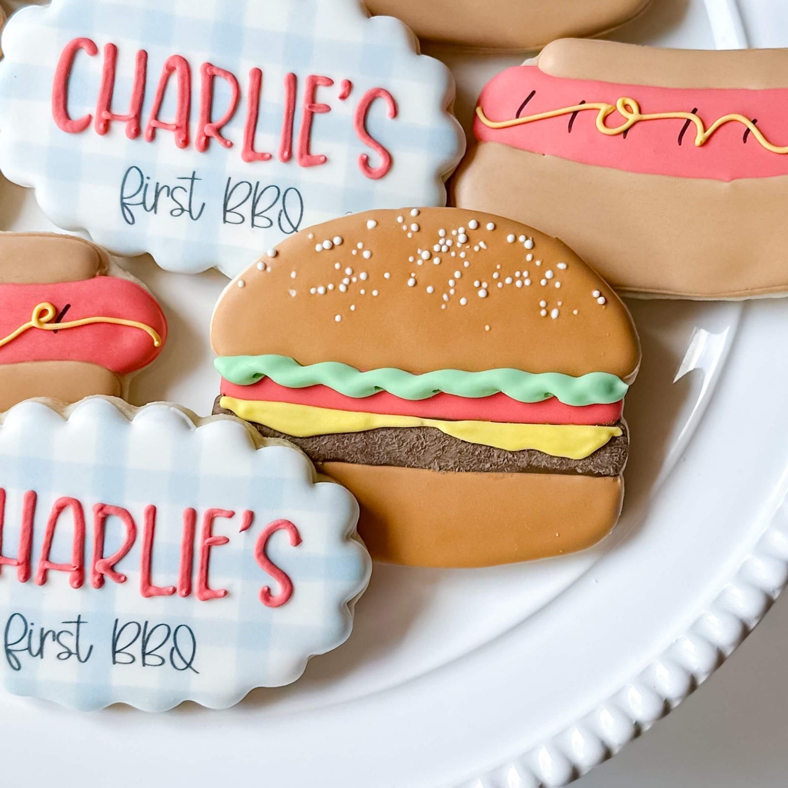 Celebrate your backyard birthday bash with these grill-tastic BBQ themed cookies. The set comes as picture with burgers, hot dogs, and personalizable plaques. Individual wrapping is included in the price.
