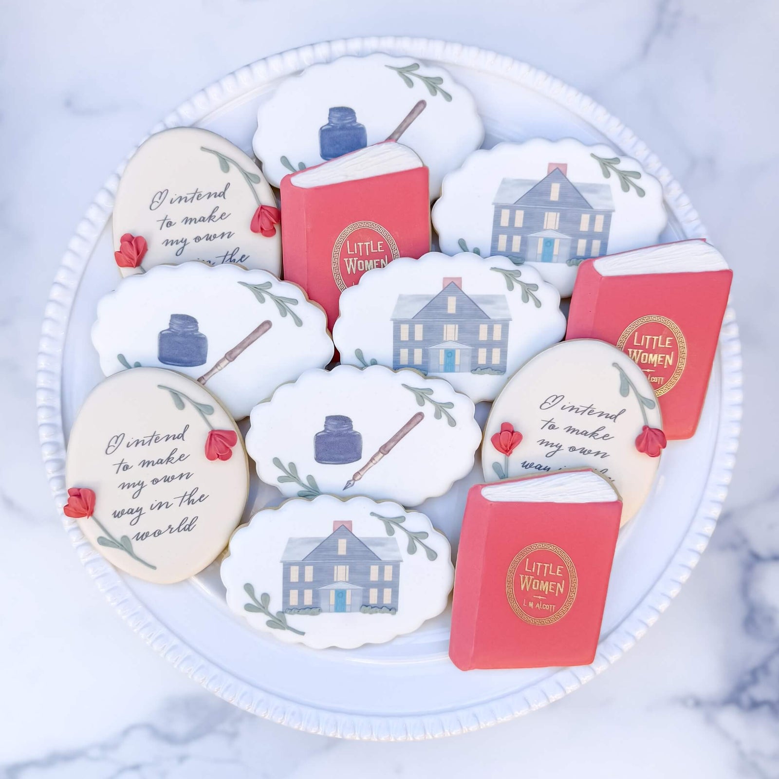 Venture to Concord with this charming cookie set, fit for all of your literary adventures. In a set that the March sisters would approve of, you'll discover Little Women book cookies, the Orchard House cookies, pen and ink cookies, and quote cookies.