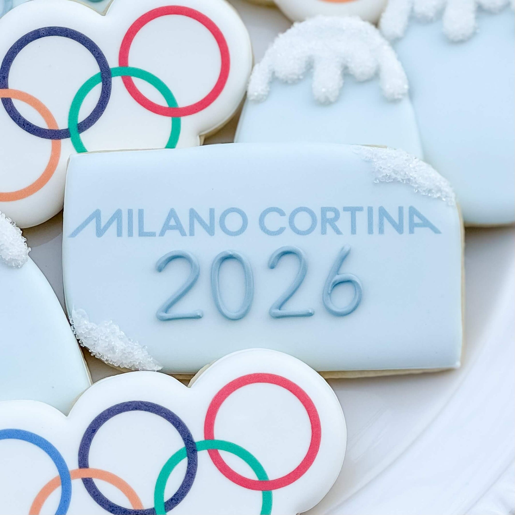 Celebrate your favorite Olympian with our Winter Olympics set! The cookies come as pictured, with Olympic rings, frosty "Milano Cortina 2026" plaques, and snowy mountains. Individual wrapping is included!
